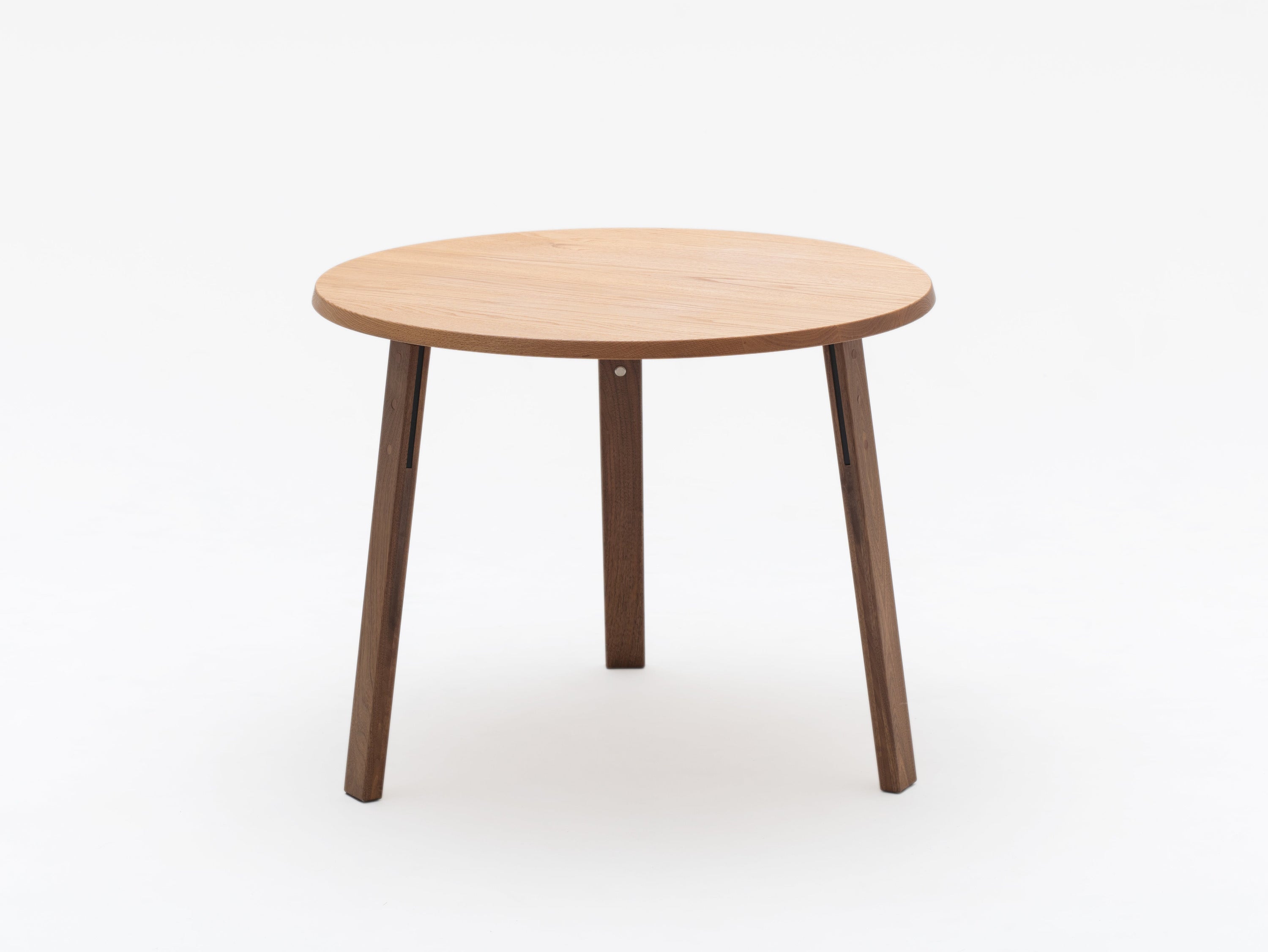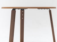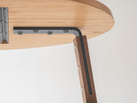 若葉家具と家具デザイナー 小泉誠とで製作したテーブル。『kaname』は木と鉄物を融合した製品。金物のLアングルを使うことで細い木部の脚でもしっかりと強度を保ち、また重心を保つことで天板のだ円や丸、特殊なデザインの形状にも対応しています。