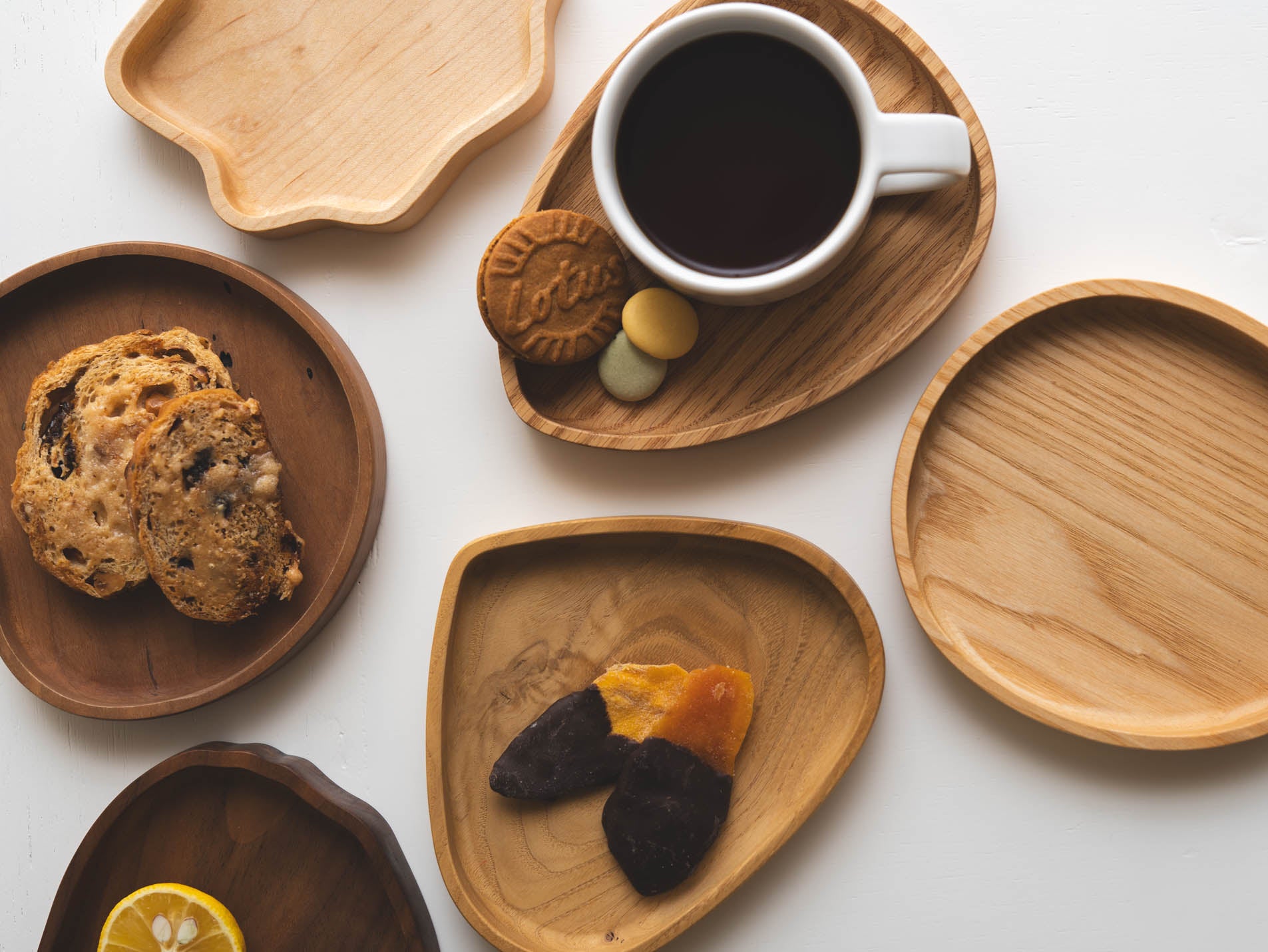 若葉家具×小泉誠のブランド『果実盆』シリーズの”楓”の葉の形のお盆とコースター。天然木の実や葉の形を、そのままお盆・コースターに仕立てた森と暮らしを繋げる道具です。身近なお盆を眺めながら森の中の木々を思い浮かべて大事にお使いください。